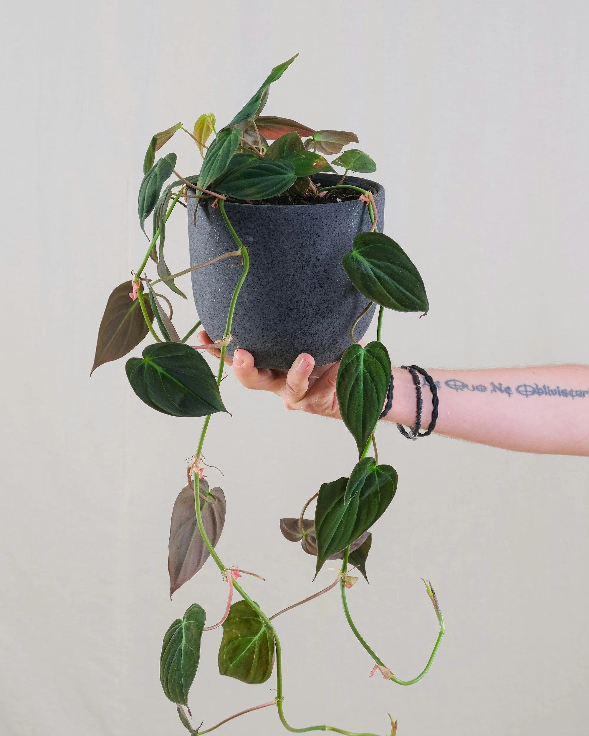 Philodendron Micans is soft, velvety, and quietly luxurious. Its heart-shaped leaves shimmer in shades of deep green, bronze, and burgundy depending on the light. It feels romantic, cozy, and slightly magical especially in hanging planters.